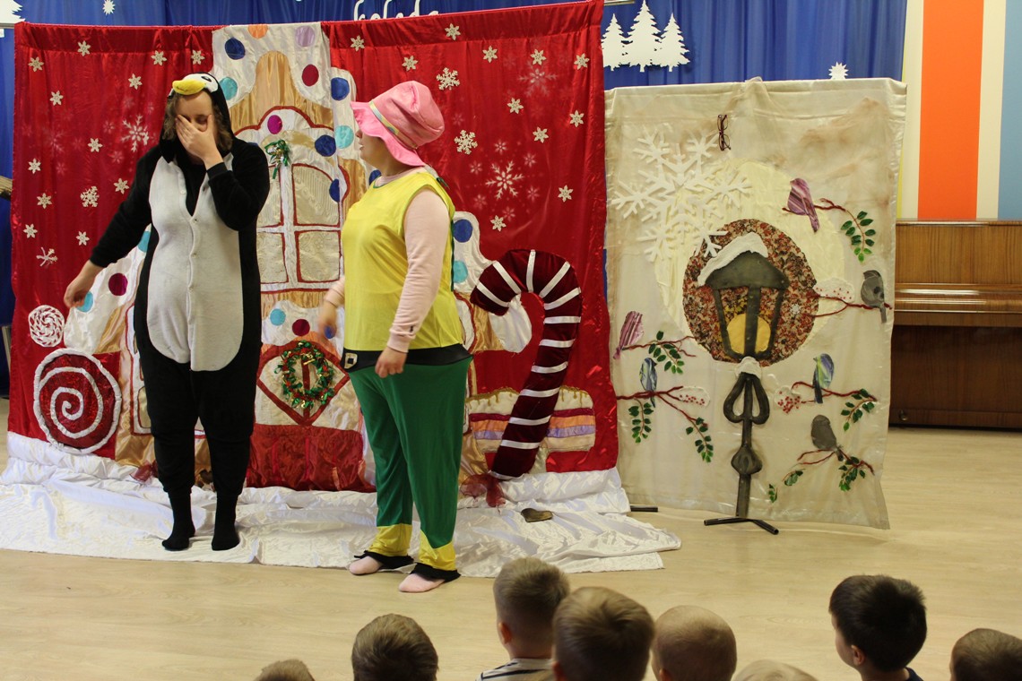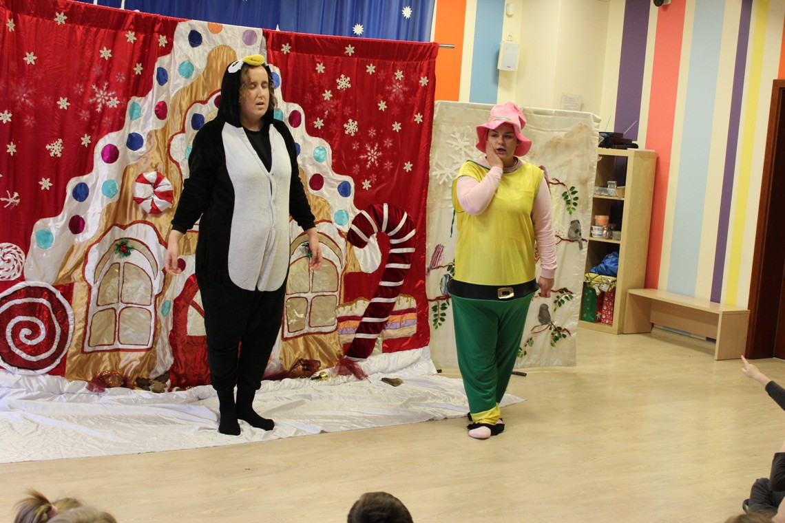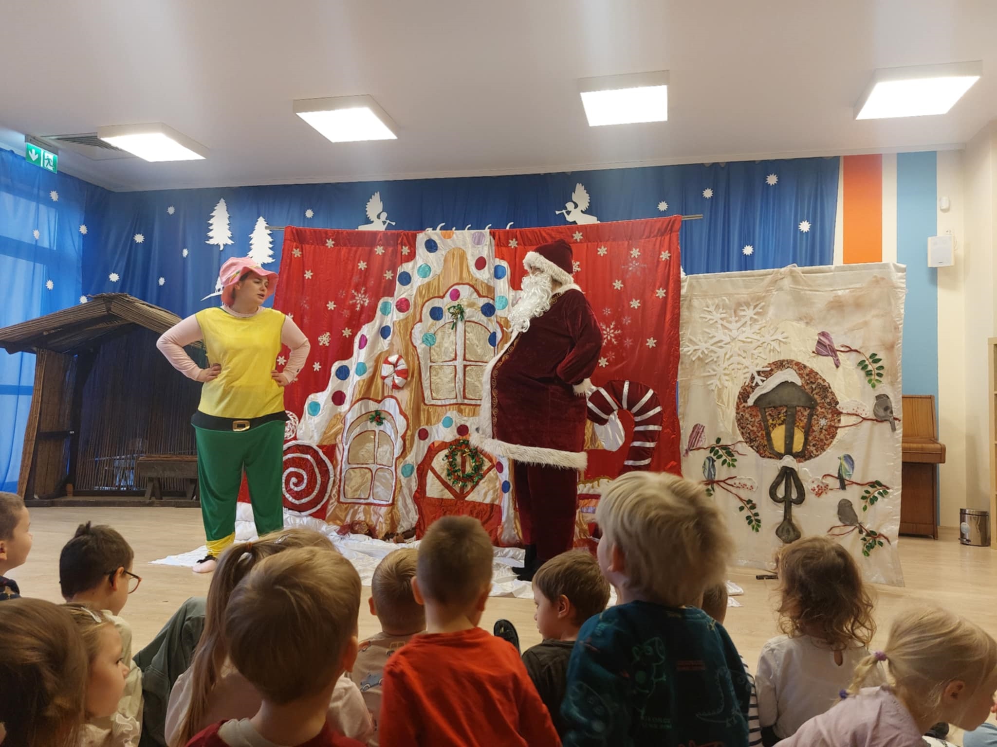 15.12.2026 dzieci obejrzały kolejny teatrzyk, tym razem było to przedstawienie pt. "Święty Mikołaj w opałach". Spektakl opowiadał o chochliku, który wyruszył w drogę, aby odnaleźć składniki do magicznego eliksiru i pomóc Świętemu Mikołajowi. Podczas swojej wędrówki bohater pomagał innym, odkrywając w sobie takie cechy, jak odwaga, mądrość i poświęcenie. Pocieszył renifera, pomógł pingwinowi mimo strachu oraz podzielił się ostatnim ciasteczkiem z głodnymi gołębiami. Przedstawienie pokazało dzieciom, że warto pomagać innym i zmieniać się na lepsze. Przedszkolaki chętnie i aktywnie uczestniczyły w spektaklu, odpowiadały na pytania chochlika oraz tańczyły wspólnie z występującymi postaciami.