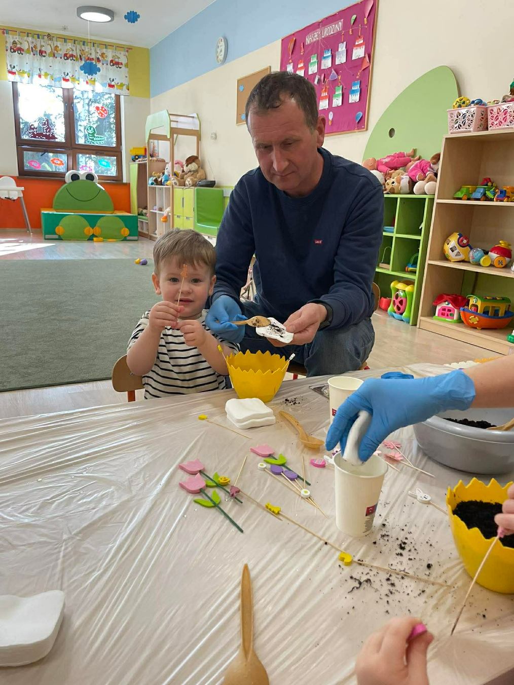 W grupie „Pszczółki” odbyły się Warsztaty Wielkanocne z udziałem rodziców. Spotkanie było doskonałą okazją do wspólnego spędzenia czasu, integracji oraz wprowadzenia wszystkich w świąteczny nastrój. Dzieci wraz z rodzicami z ogromnym zaangażowaniem siały rzeżuchę oraz ozdabiały swoje prace kolorowymi dekoracjami związanymi z Wielkanocą. Powstały piękne, wiosenne kompozycje pełne barw i świątecznych motywów. Warsztaty przebiegły w miłej, rodzinnej atmosferze, a wspólnie wykonane ozdoby będą wyjątkową dekoracją wielkanocnych stołów.